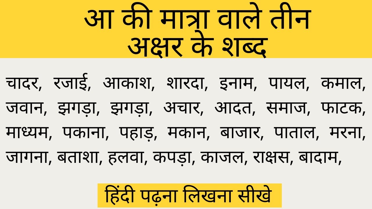 9 min(s) Hindi Aa ki matra wale shabd teen akshar ke hindi mai