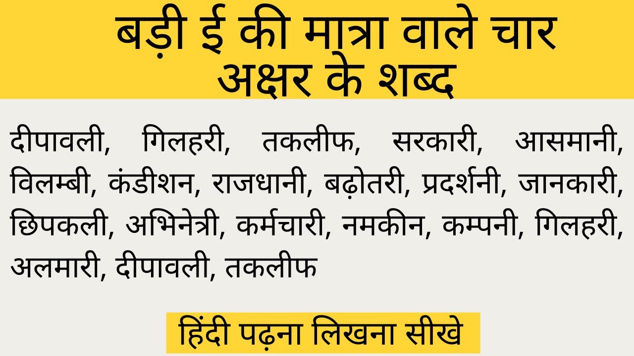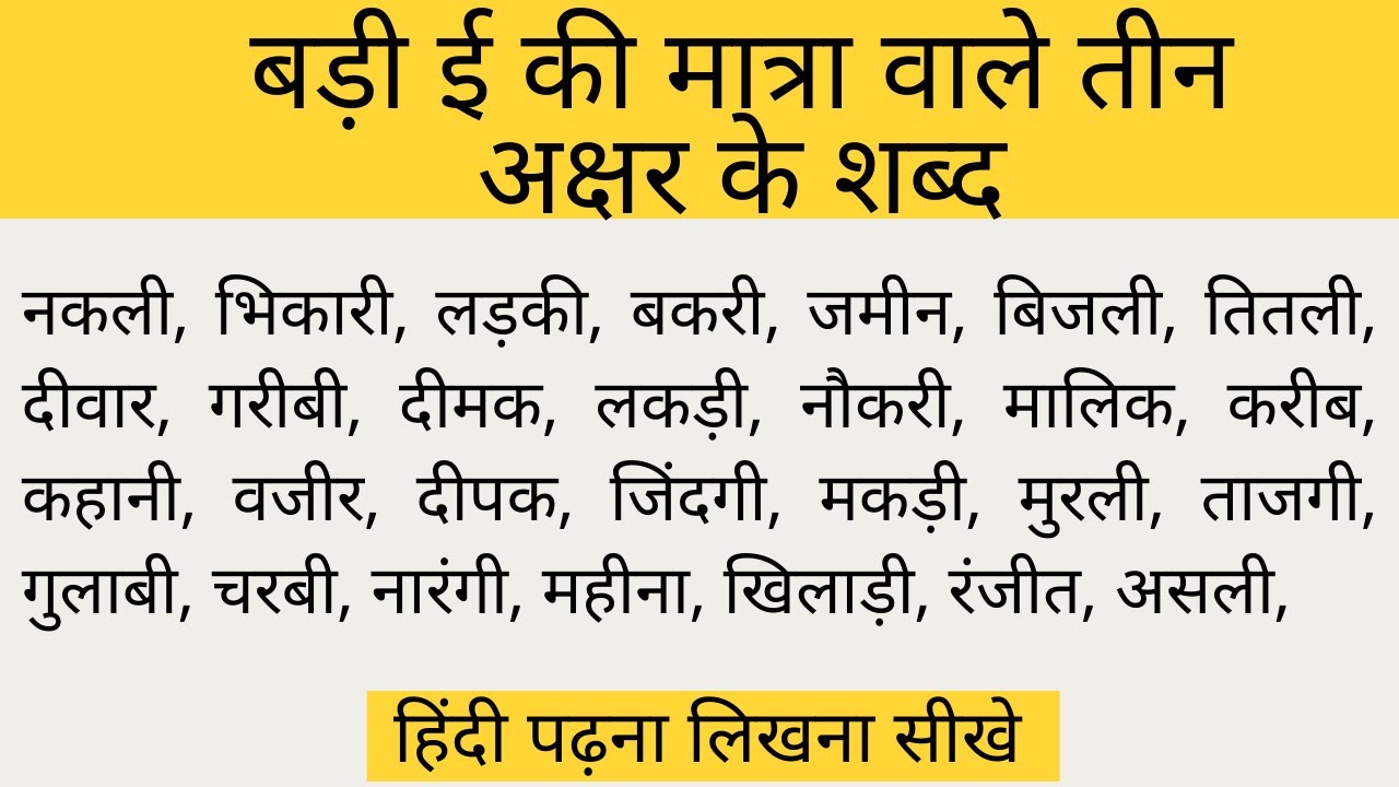4 min(s) Hindi Badi ee ki matra wale shabd teen akshar ke hindi mai