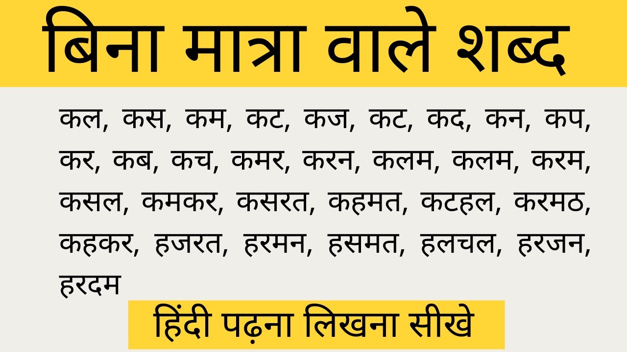 27 min(s) Hindi Bina matra wale shabd hindi mai (2, 3, 4, 5 akshar)