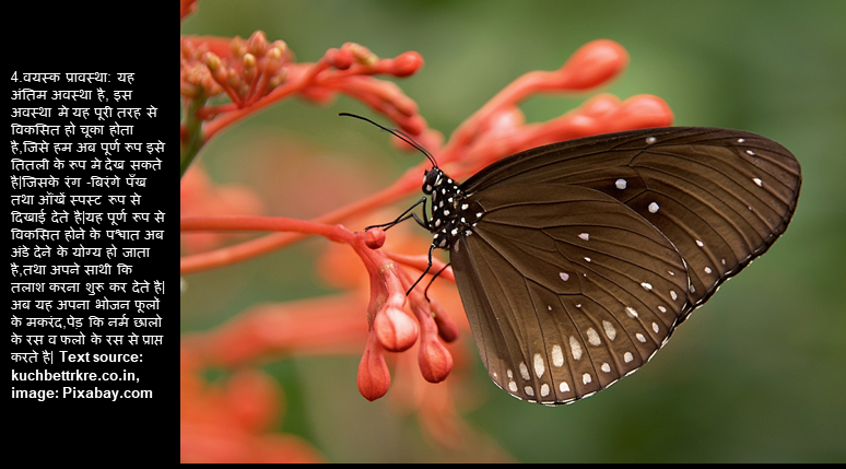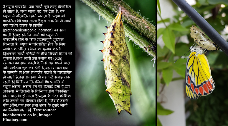 सभी तितलियों में "complete metamorphosis" होता है। वयस्क होने के लिए वे 4 चरणों से गुजरती है: अंडा, लार्वा, प्यूपा और वयस्क। प्रत्येक चरण का एक अलग लक्ष्य होता है - उदाहरण के लिए, कैटरपिलर को बहुत अधिक खाने की आवश्यकता होती है, और वयस्कों को प्रजनन करने की आवश्यकता होती है। तितली के प्रकार के आधार पर, तितली के जीवन चक्र में एक महीने से लेकर पूरे एक साल तक का समय लग सकता है। अधिक जानकारी के लिए विजिट करें myhighinfo.blogspot.com
