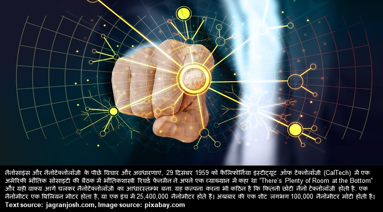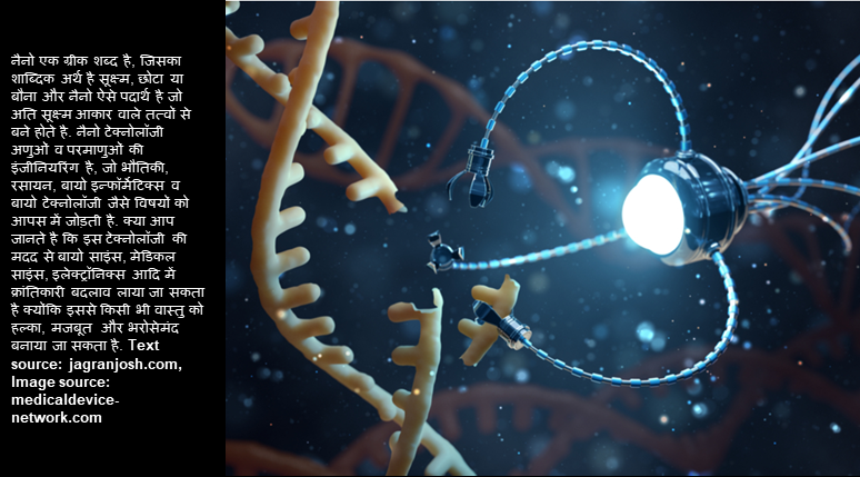 नैनोतकनीक या नैनोप्रौद्योगिकी, व्यावहारिक विज्ञान के क्षेत्र में, १ से १०० नैनो (अर्थात 10−9 m) स्केल में प्रयुक्त और अध्ययन की जाने वाली सभी तकनीकों और सम्बन्धित विज्ञान का समूह है। नैनोतकनीक में इस सीमा के अन्दर जालसाजी के लिये विस्तृत रूप में अंतर-अनुशासनात्मक क्षेत्रों, जैसे व्यावहारिक भौतिकी, पदार्थ विज्ञान, अर्धचालक भौतिकी, विशाल अणुकणिका रसायन शास्त्र (जो रासायन शास्त्र के क्षेत्र में अणुओं के गैर कोवलेन्त प्रभाव पर केन्द्रित है), स्वयमानुलिपिक मशीनएं और रोबोटिक्स, रसायनिक अभियांत्रिकी, याँत्रिक अभियाँत्रिकी और वैद्युत अभियाँत्रिकी. अभी यह कहना मुशकिल है कि इन रेखाओं में अनुसन्धान के क्या परिणाम होंगे। नैनोप्रौद्योगिकी को विद्यमान विज्ञान का नैनो स्केल में विस्तारीकरण, या विद्यमान विज्ञान को एक नये आधुनिक शब्ध में पुनराधारित कर रहा है। अधिक जानकारी के लिए विजिट करें hi.wikipedia.org