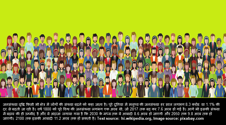 जनसंख्या वृद्धि किसी भी क्षेत्र में लोगों की संख्या बढ़ने को कहा जाता है। पूरे दुनिया में मनुष्य की जनसंख्या हर साल लगभग 8.3 करोड़ या 1.1% की दर से बढ़ती जा रही है। वर्ष 1800 को पूरे विश्व की जनसंख्या लगभग एक अरब थी, जो 2017 तक बढ़ कर 7.6 अरब हो गई है। आगे भी इसकी संख्या में बढ़ाव की ही उम्मीद है और ये अंदाजा लगाया गया है कि 2030 के मध्य तक ये आबादी 8.6 अरब हो जाएगी और 2050 तक 9.8 अरब तक हो जाएगी। 2100 तक इसकी आबादी 11.2 अरब तक हो सकती है। अधिक जानकारी के लिए विजिट करें hi.wikipedia.org