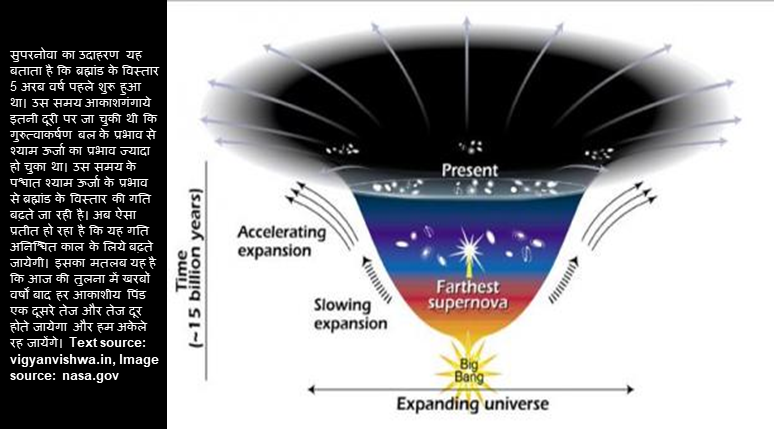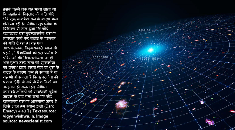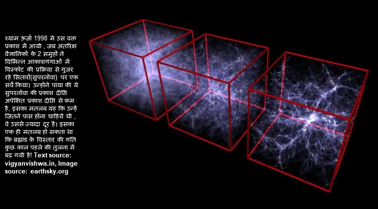 यह विषय एक विज्ञान फैटंसी फिल्म की कहानी के जैसा है। श्याम ऊर्जा(Dark Energy), एक रहस्यमय बल जिसे कोई समझ नहीं पाया है, लेकिन इस बल के प्रभाव से ब्रह्मांड के पिंड एक दूसरे से दूर और दूर होते जा रहे है।