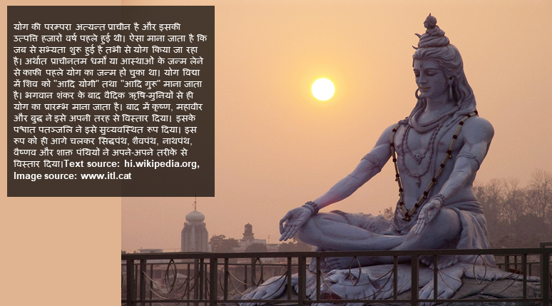 योग की परम्परा भारत में हजारों साल से चली आ रही है, योग दर्शन के प्रणेता महर्षि पतंजलि द्वारा 'योग सूत्र' की रचना से भी पहले से। भारतीय संस्कृति में शिव को पहला योगी माना गया है। उन्होंने ही योग विज्ञान की नींव डाली थी। Source: www.livehindustan.com