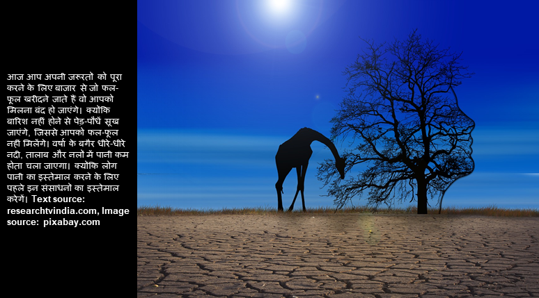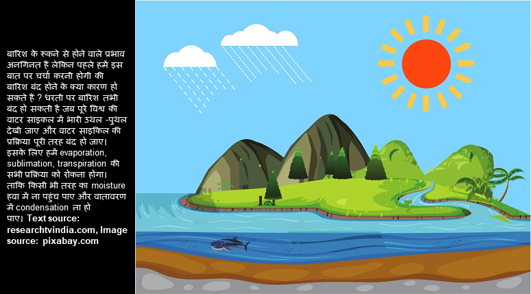 मानसून के मौसम में आपने चाय और पकोड़े का तो खूब आनंद उठाया होगा लेकिन अगर आज हम कहें कि अब आप कभी मानसून के मजे नही ले पाएंगे तो आपकी क्या प्रतिक्रिया होगी? बारिश के रूकने से होने वाले प्रभाव अनगिनत हैं लेकिन पहले हमें इस बात पर चर्चा करनी होगी की बारिश बंद होने के क्या कारण हो सकते हैं ? धरती पर बारिश तभी बंद हो सकती है जब पूरे विश्व की वाटर साइकल में भारी उथल -पुथल देखी जाए और वाटर साइकिल की प्रक्रिया पूरी तरह बंद हो जाए। इसके लिए हमें evaporation, sublimation, transpiration की सभी प्रक्रिया को रोकना होगा। ताकि किसी भी तरह का moisture हवा में ना पहुंच पाए और वातावरण में condensation ऩा हो पाए। अधिक जनकारी के लिए यूआरएल पर जाएँ researchtvindia.com