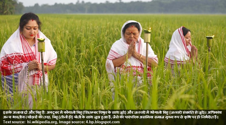 बैसाख बिहू - असमिया कैलेंडर बैसाख महीने से शुरू होता है जो अंग्रेजी माह के अप्रैल महीने के मध्य में शुरू होता है और यह बिहू सात दिन तक अलग-अलग रीति-रीवाज के साथ मनाया जाता है। बैसाख महीने का संक्रांति से बोहाग बिहू शुरू होता है। इसमें प्रथम दिन को गाय बिहू कहा जाता है। इस दिन लोग सुबह अपनी-अपनी गायों को नदी में ले जाकर नहलाते हैं। आगे जनने के लिए दिए गए यूआरएल पर जाएँ hindi.webdunia.com