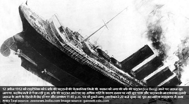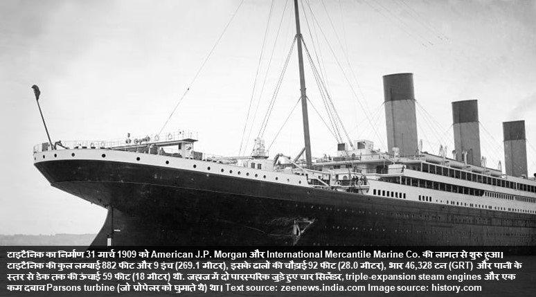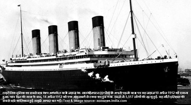 RMS टाइटैनिक दुनिया का सबसे बड़ा वाष्प आधारित यात्री जहाज था। वह साउथम्पटन (इंग्लैंड) से अपनी प्रथम यात्रा पर, 10 अप्रैल 1912 को रवाना हुआ। चार दिन की यात्रा के बाद, 14 अप्रैल 1912 को वह एक हिमशिला से टकरा कर डूब गया जिसमें 1,517 लोगों की मृत्यु हुई जो इतिहास की सबसे बड़ी शांतिकाल समुद्री आपदाओं में से एक है। अधिक जानकारी के लिए यूआरएल पर जाएँ hi.wikipedia.org