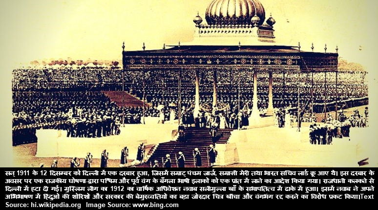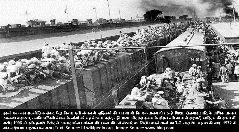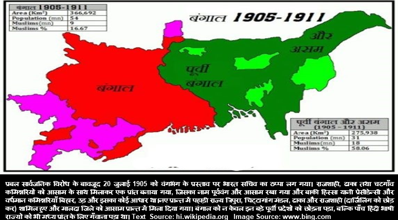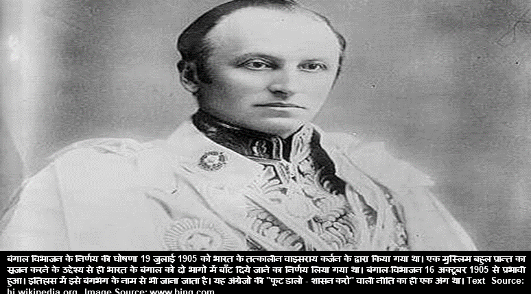 बंगाल विभाजन के निर्णय की घोषणा 19 जुलाई 1905 को भारत के तत्कालीन वाइसराय कर्जन के द्वारा किया गया था। एक मुस्लिम बहुल प्रान्त का सृजन करने के उद्देश्य से ही भारत के बंगाल को दो भागों में बाँट दिये जाने का निर्णय लिया गया था। बंगाल-विभाजन 16 अक्टूबर 1905 से प्रभावी हुआ। इतिहास में इसे बंगभंग के नाम से भी जाना जाता है। अधिक जानकारी के लिए दिए गए यूआरएल पर जाएँ hi.wikipedia.org